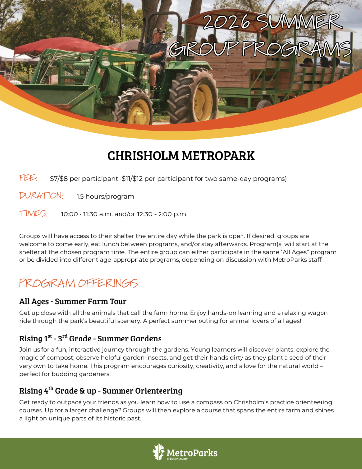 The Friends of Chrisholm will offer assistance to Butler County public schools for costs associated with field trips to Chrisholm MetroPark. Scholarships cover the cost of transportation/busing for students and teachers. For more information and to apply, click here.